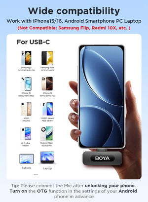• Tips:BY-V10/20 is compatible with Huawei P20/P30/mate 30,Samsung S20 Ultra/Note10, Xiaomi 11Ultra,Redmi 10X and other USB-C devices. OPPO VIVO please turn on the OTG function in the settings, otherwise the microphone will not work properly.