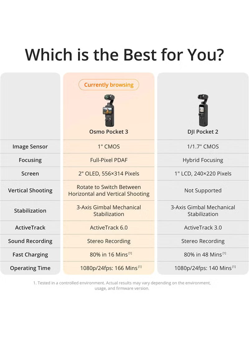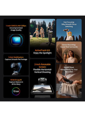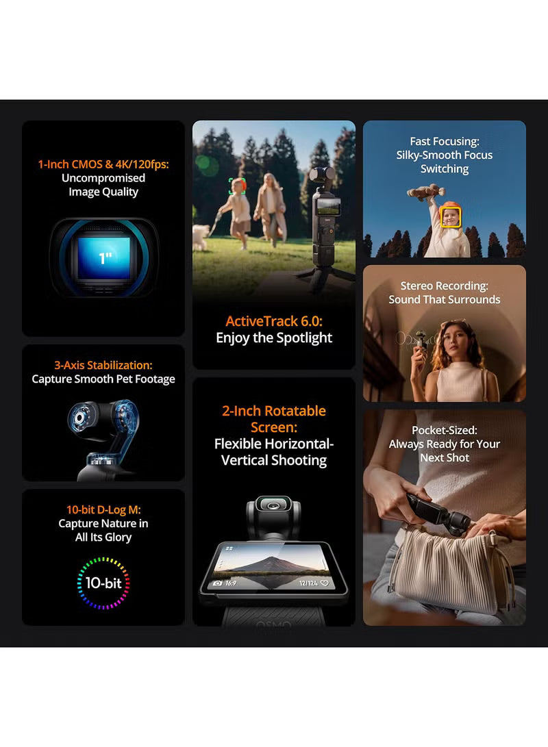 The all-new Pocket 3 features a powerful 1-inch CMOS sensor that puts detail-rich imaging right in the palm of your hand. With a 2-inch rotatable touchscreen and full-pixel fast focusing, go horizontal or vertical for more precise awareness and control. 4K/120fps, three-axis mechanical stabilization, and a host of intelligent features make Pocket 3 ready for any moving moment. The 1-inch CMOS sensor captures clear highlight-shadow details, delivering amazing footage even in low-light scenarios. With 4K/120fps capability, savor every breathtaking moment in slow motion.10-bit D-Log M and HLG, record landscapes with professional-level color flexibility for true-to-life colors and a full-spectrum visual experience.