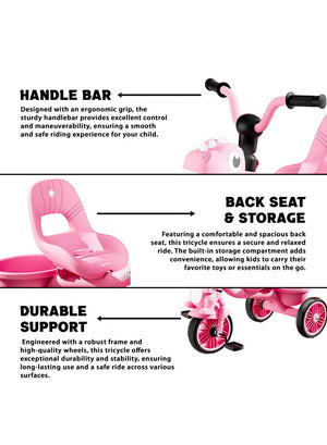 • Convenient Storage Basket: This kids tricycle comes with a spacious storage basket, ideal for carrying toys for girls or boys. Whether it's a favorite teddy or essential snacks, this cycle for kids ensures their treasures are always within reach.