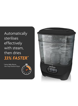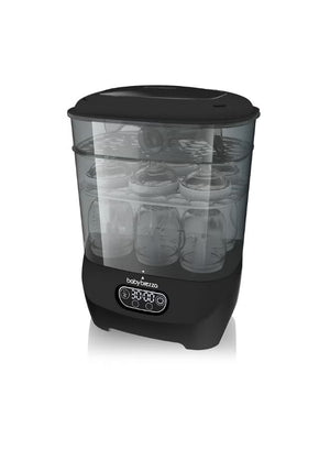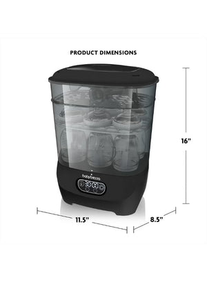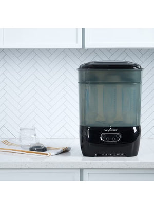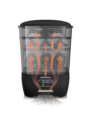 Baby Brezza One Step Sterilizer Dryer Advanced automatically sterilizes, then dries 33% faster. It uses natural steam to eliminate 99.9% of harmful bacteria, mold and the yeast that causes thrush, then dries with 95% germ-free, HEPA-filtered air. Products stay sterilized inside for up to 48 hours. It has the largest capacity - holding 8 bottles, 2 full pump parts sets (including wearable pump parts) and accessories from any brand. Plus it's modular so you can use it 4 different ways. Choose from 4 functions (Sterilize & Dry, Sterilize Only, Dry Only, or Storage Rack) using the LCD control panel. The digital display also features a countdown timer. 1 year limited warranty